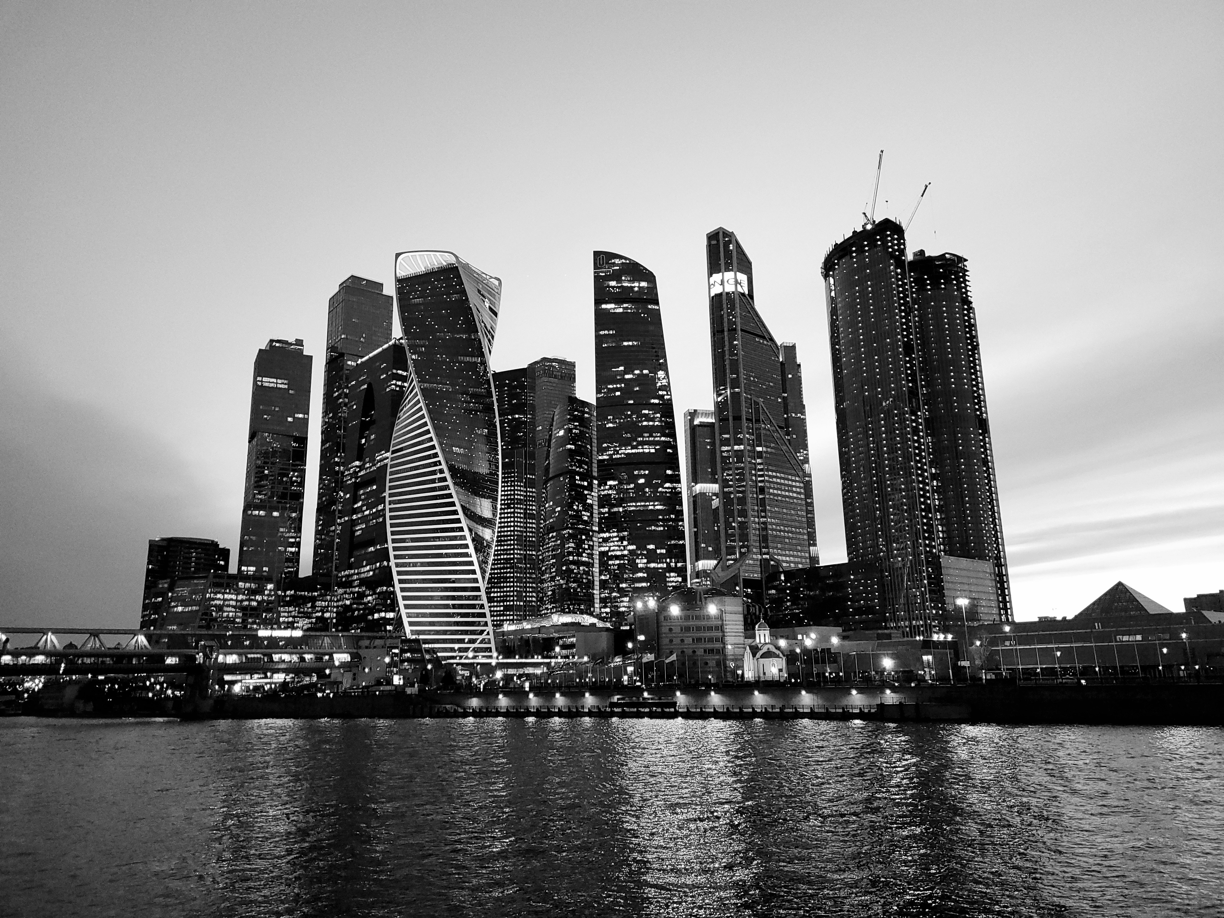 Modern Johannesburg skyline at dusk with illuminated skyscrapers and business district